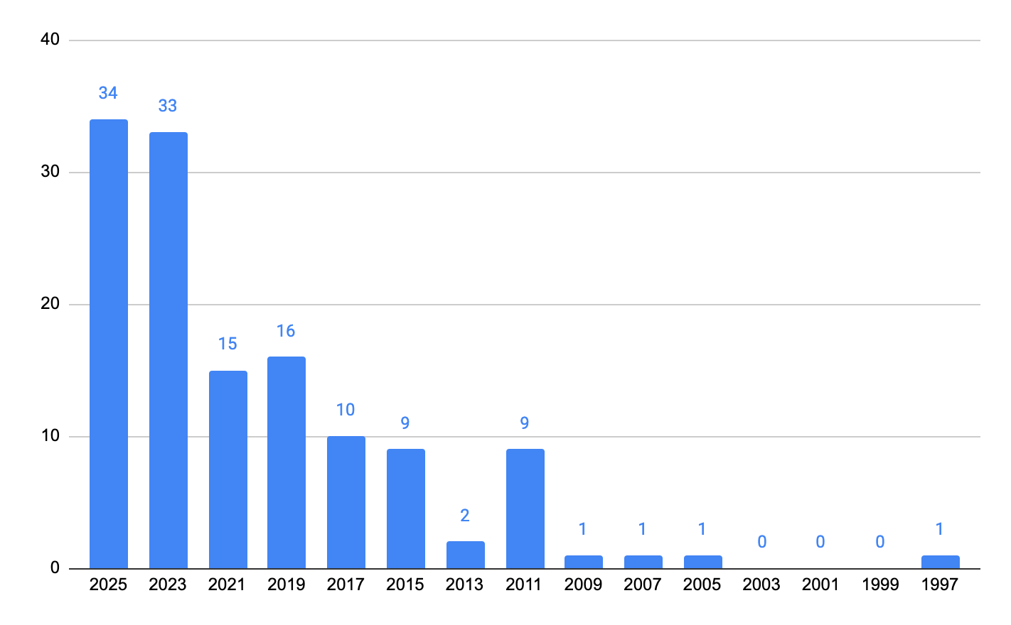 Chart 1: Year in which county commissioners took office, 1997-2025: