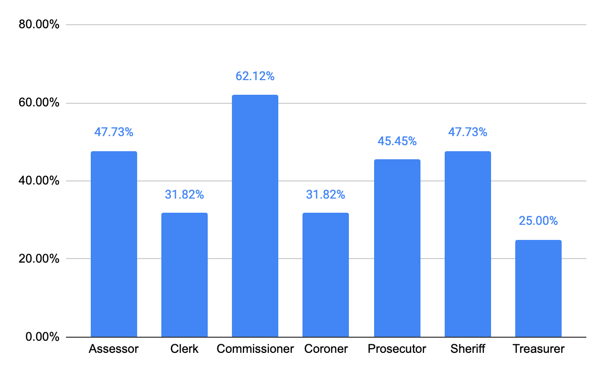 Since 2021, turnover rate has also been high with county assessors (47.73%), county prosecuting attorneys (45.45%), and county sheriffs (47.73%). Chart 2 below visualizes the turnover rate by county office since 2021.