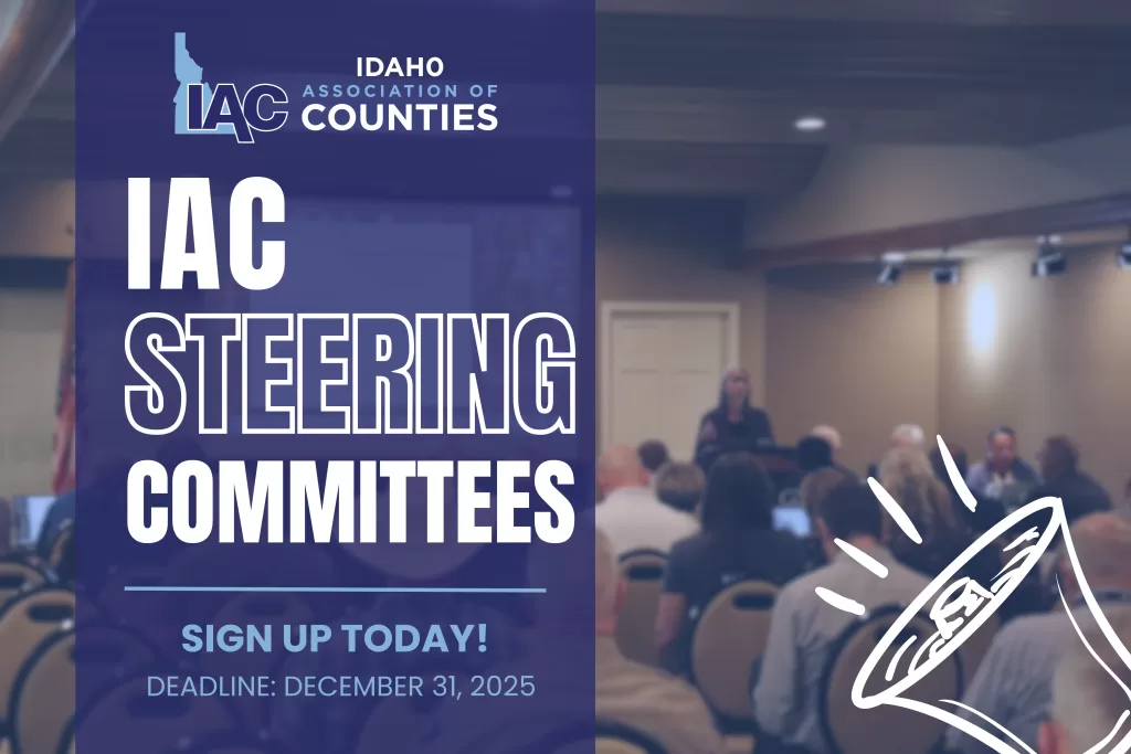 Don’t miss this chance to have your voice heard and help shape the policies that matter most. Join a steering committee today! If you’re passionate about county governance and want to help guide critical policy discussions in Idaho, now is the time to act. The Idaho Association of Counties (IAC) is accepting applications for membership on up to two steering committees for the 2026 year. The committees meet in person during the IAC Midwinter Legislative Conference and the IAC Annual Conference….